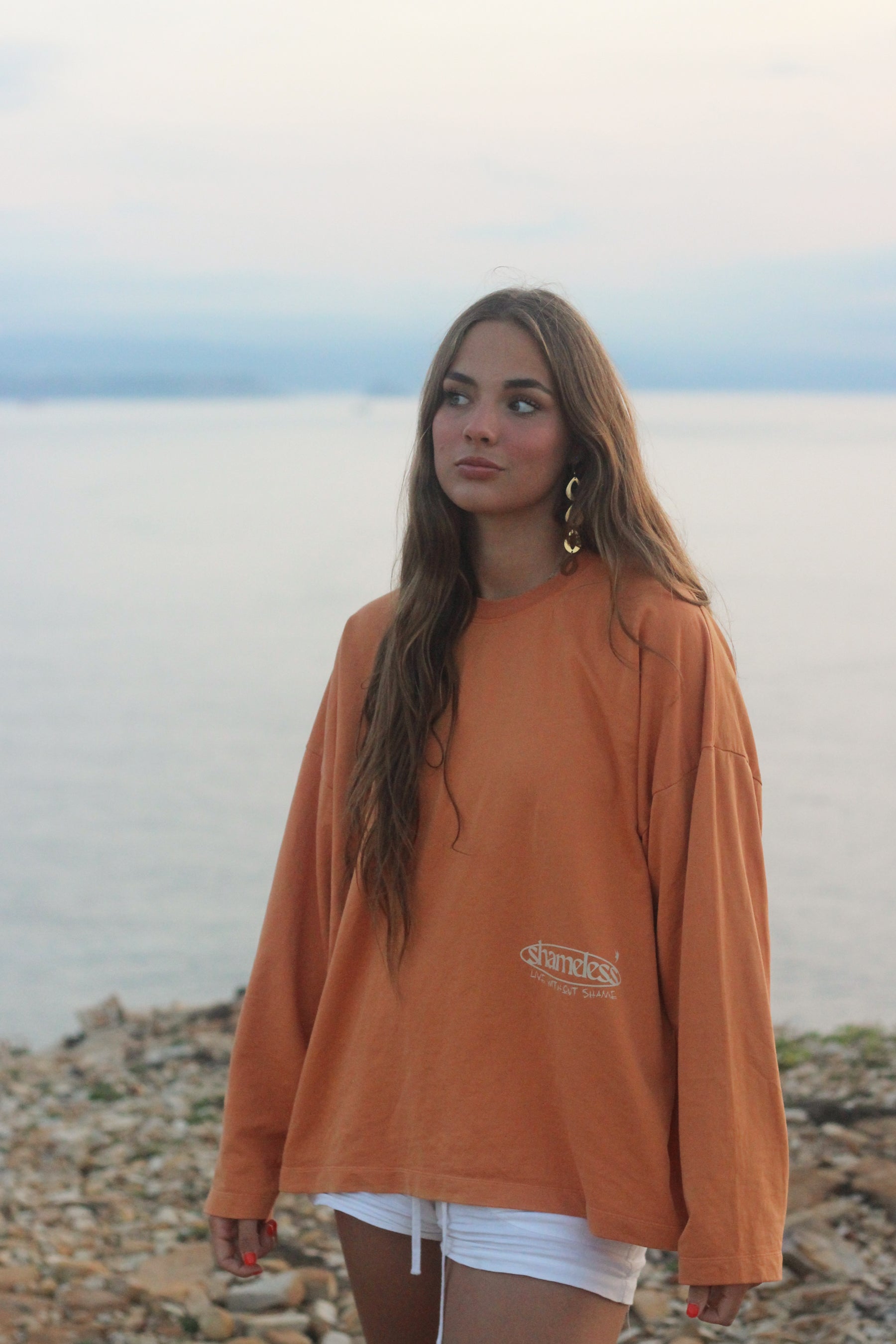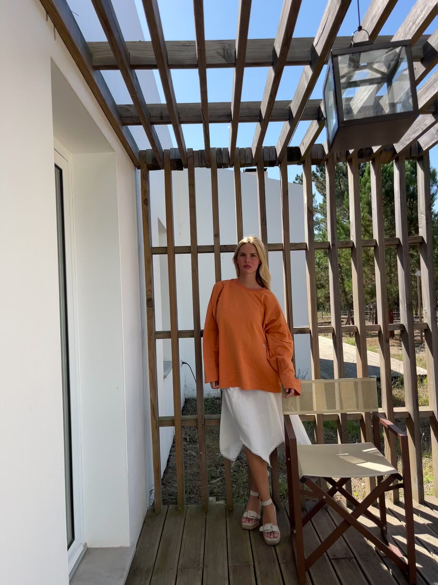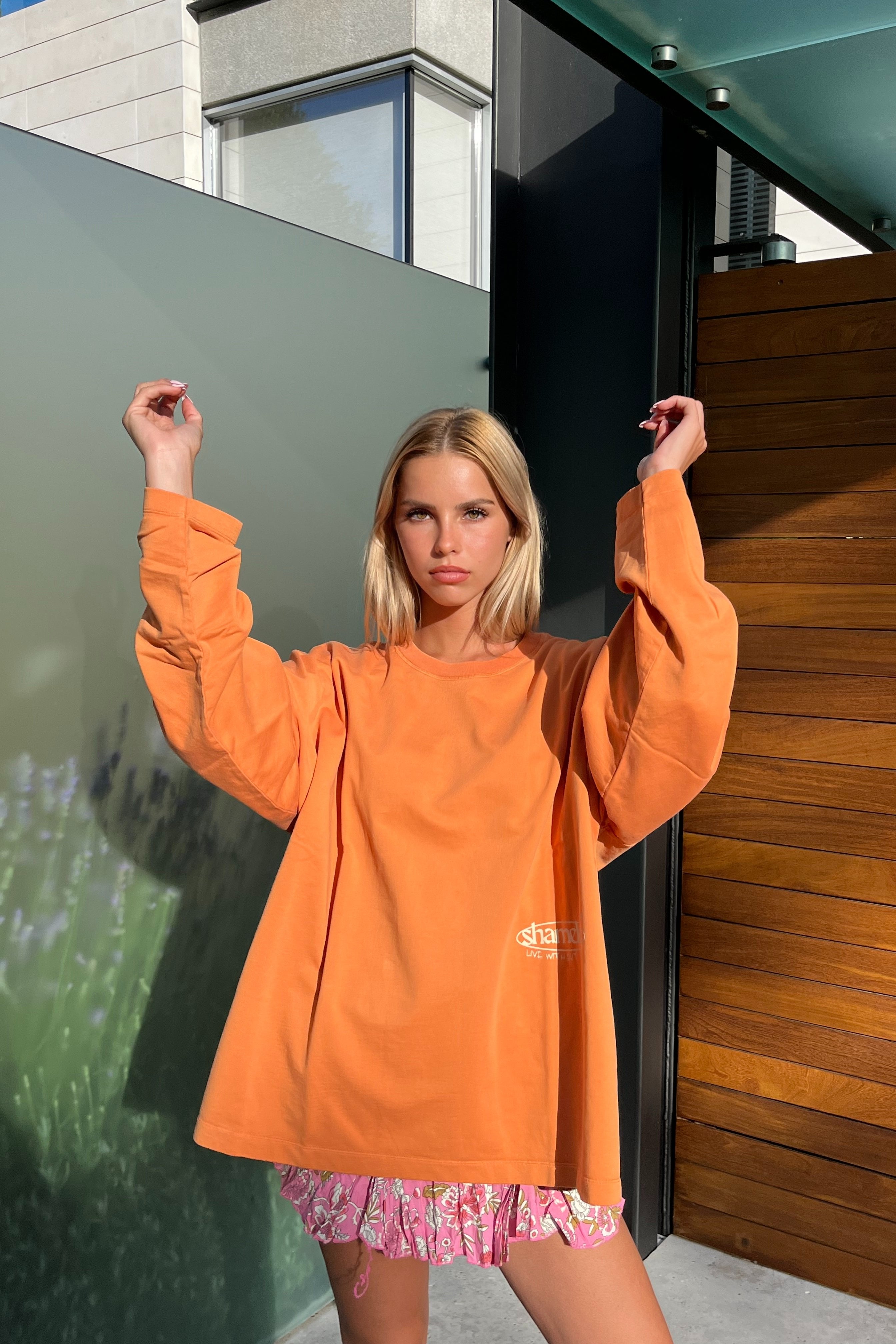 Orange crewneck made from midweight cotton fabric with an oversized fit. Details printed in off-orange.