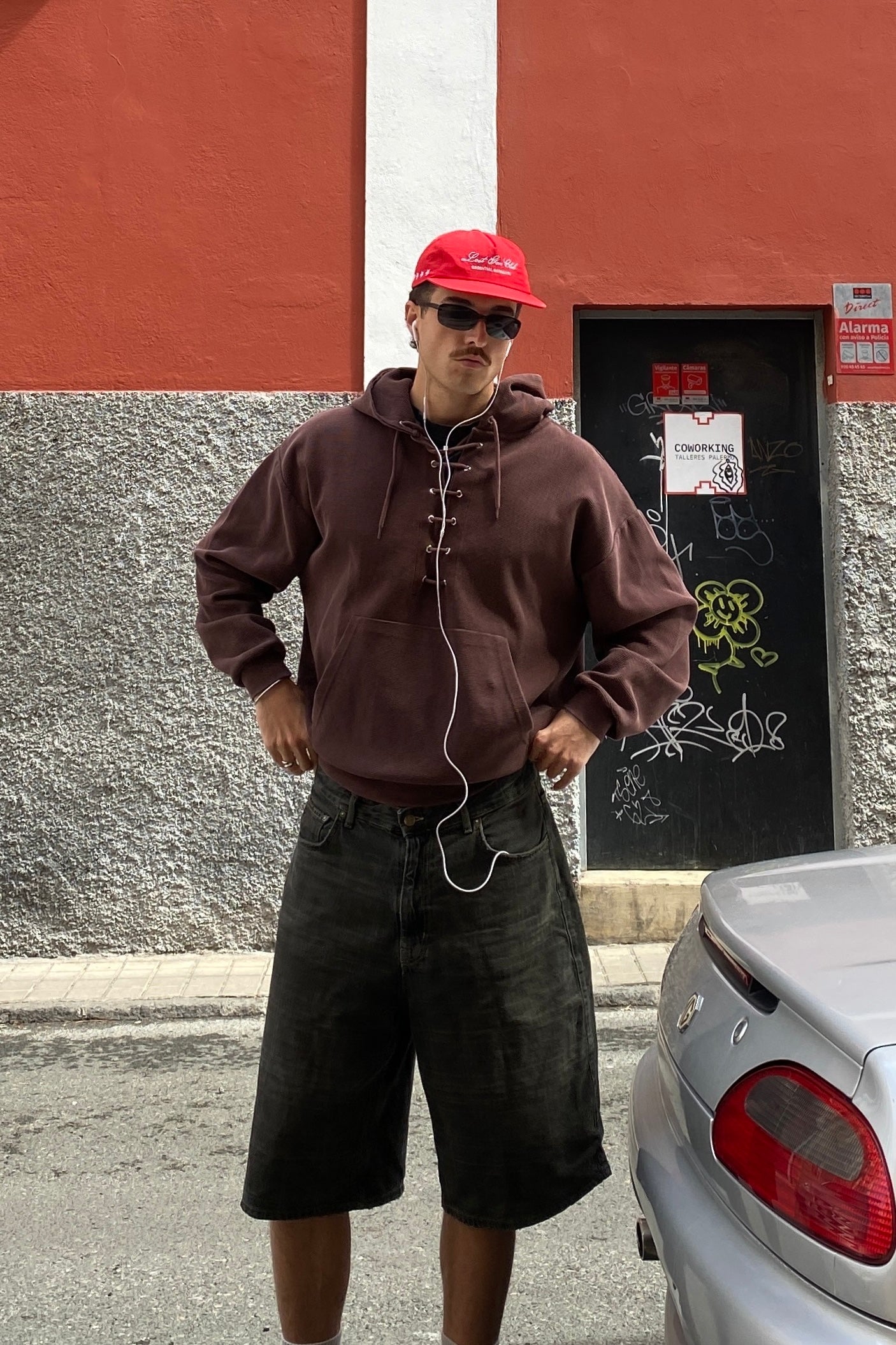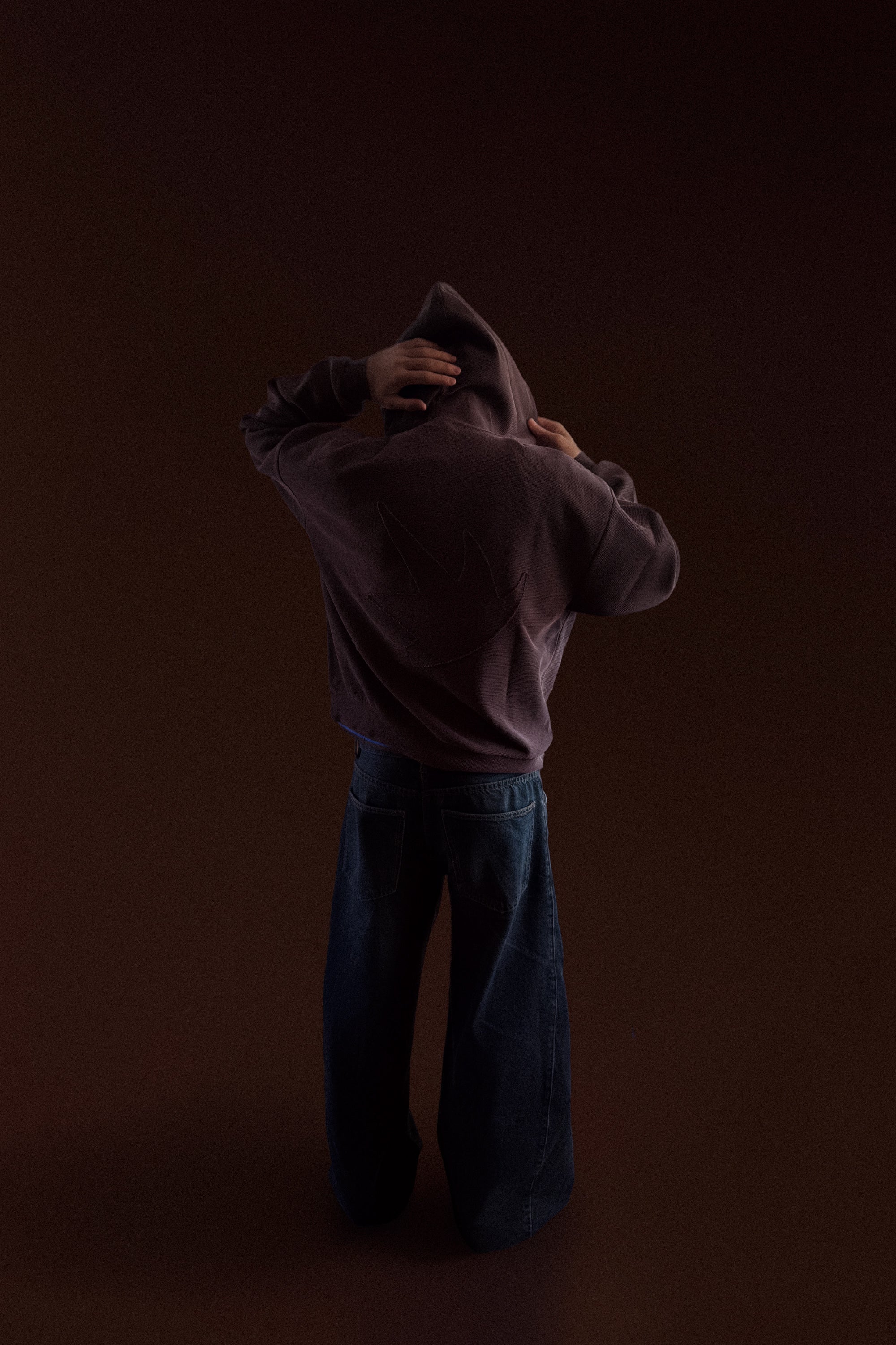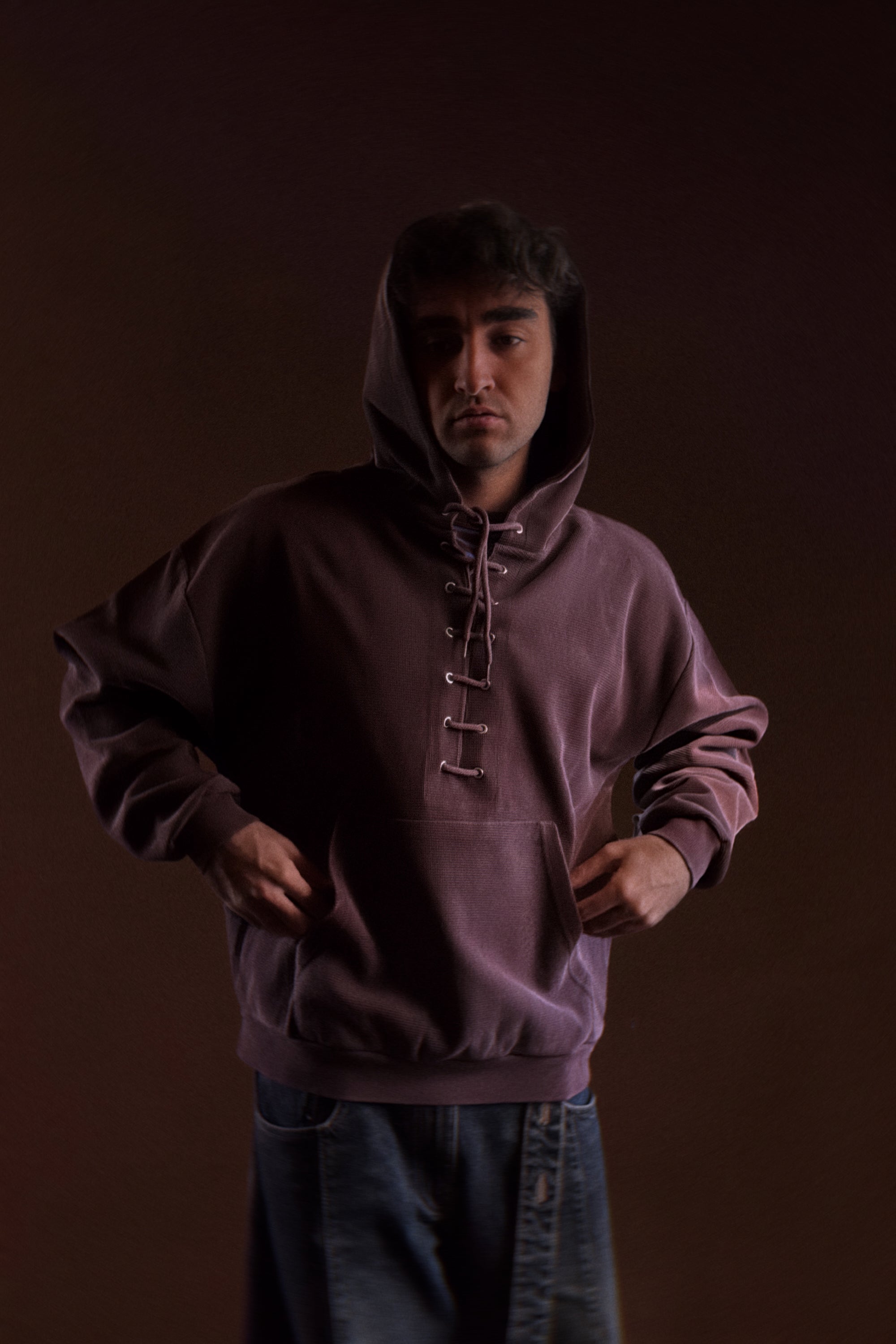 Washed dark brown hoodie made from extra-heavyweight waffle cotton fabric with an oversized fit. Corset-style lace-up closure. Details embroidered with the same fabric.