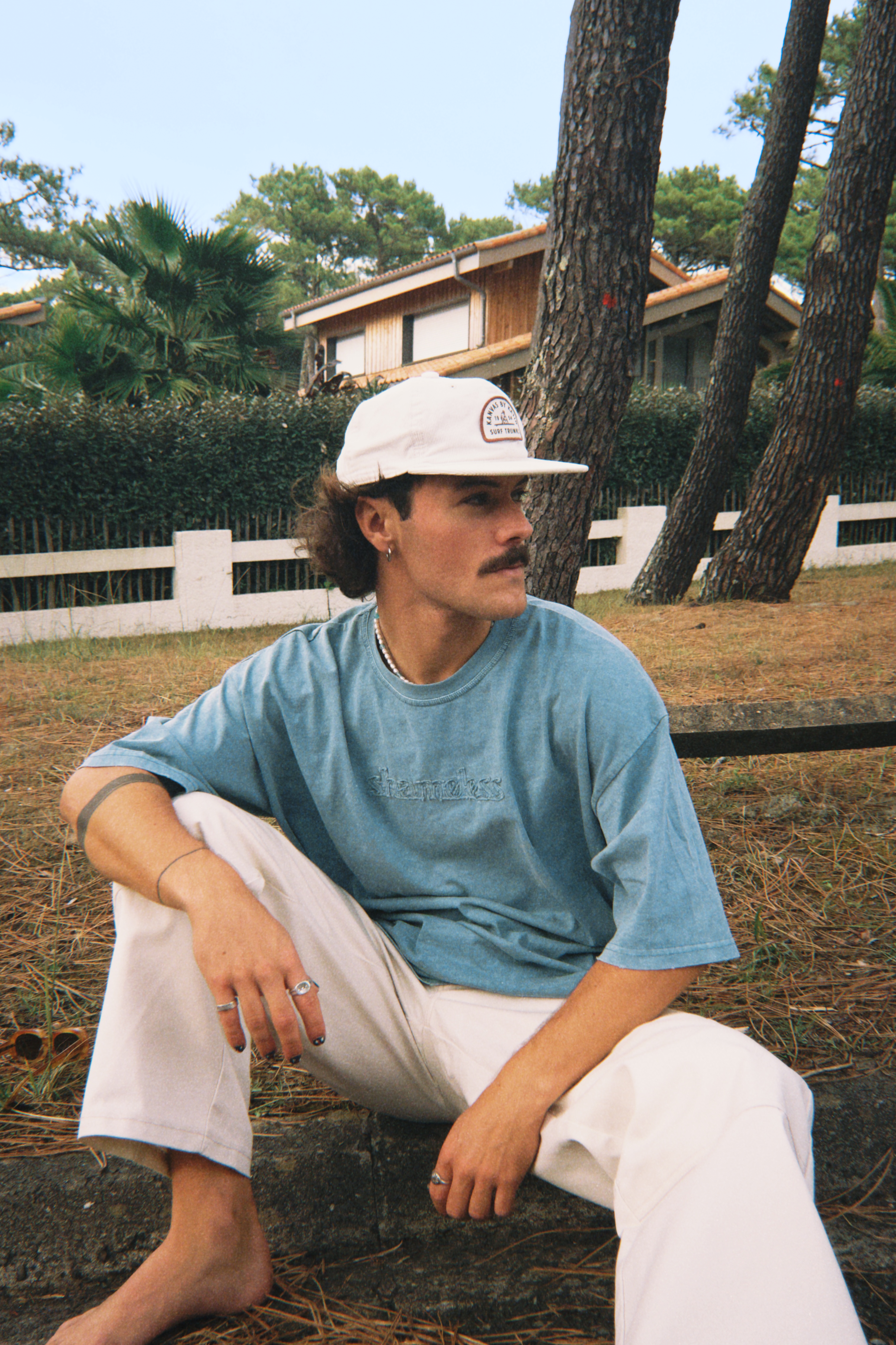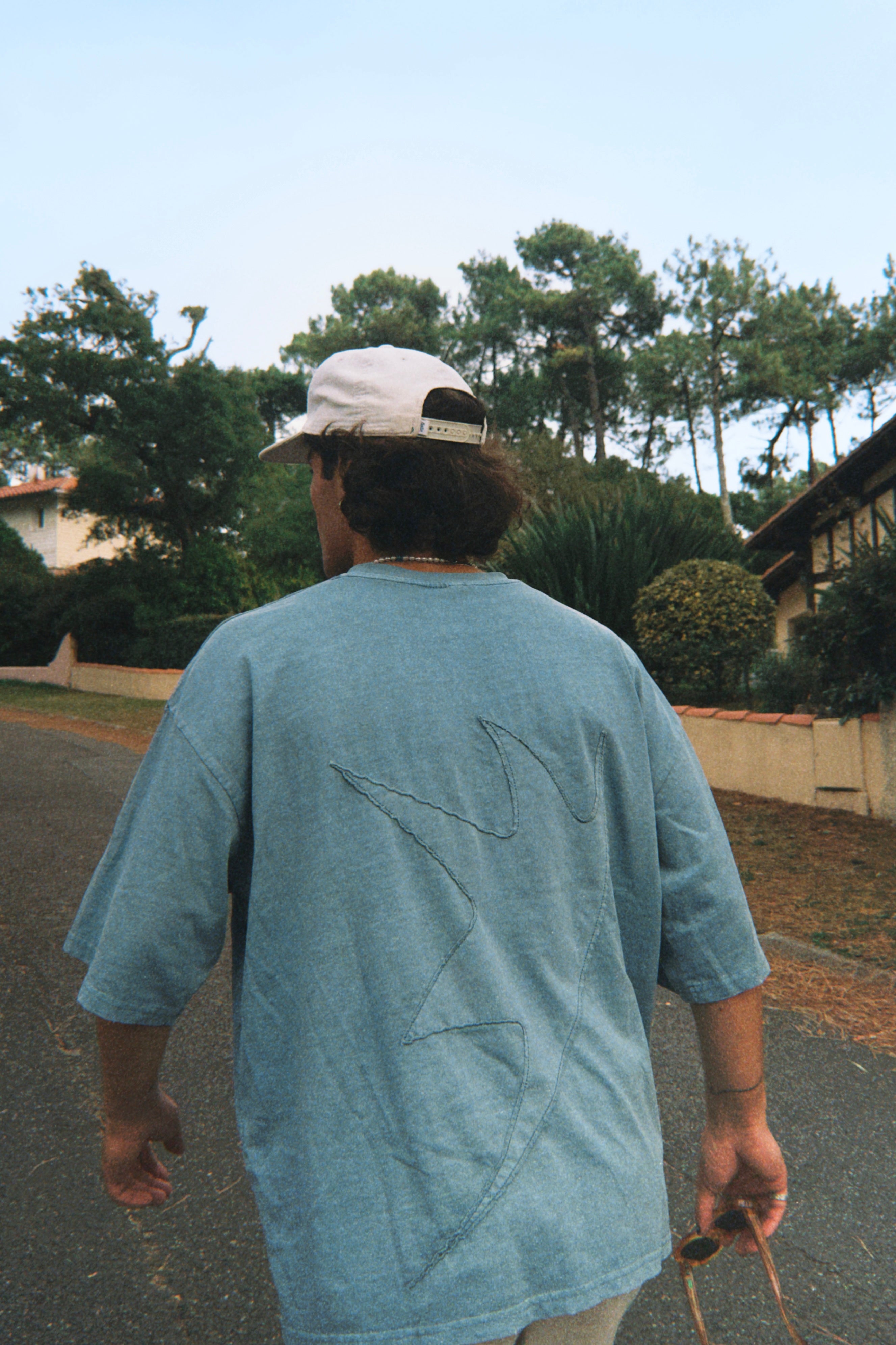 Washed water green T-Shirt made from midweight cotton fabric with an oversized fit. Details embroidered with the same cotton fabric.