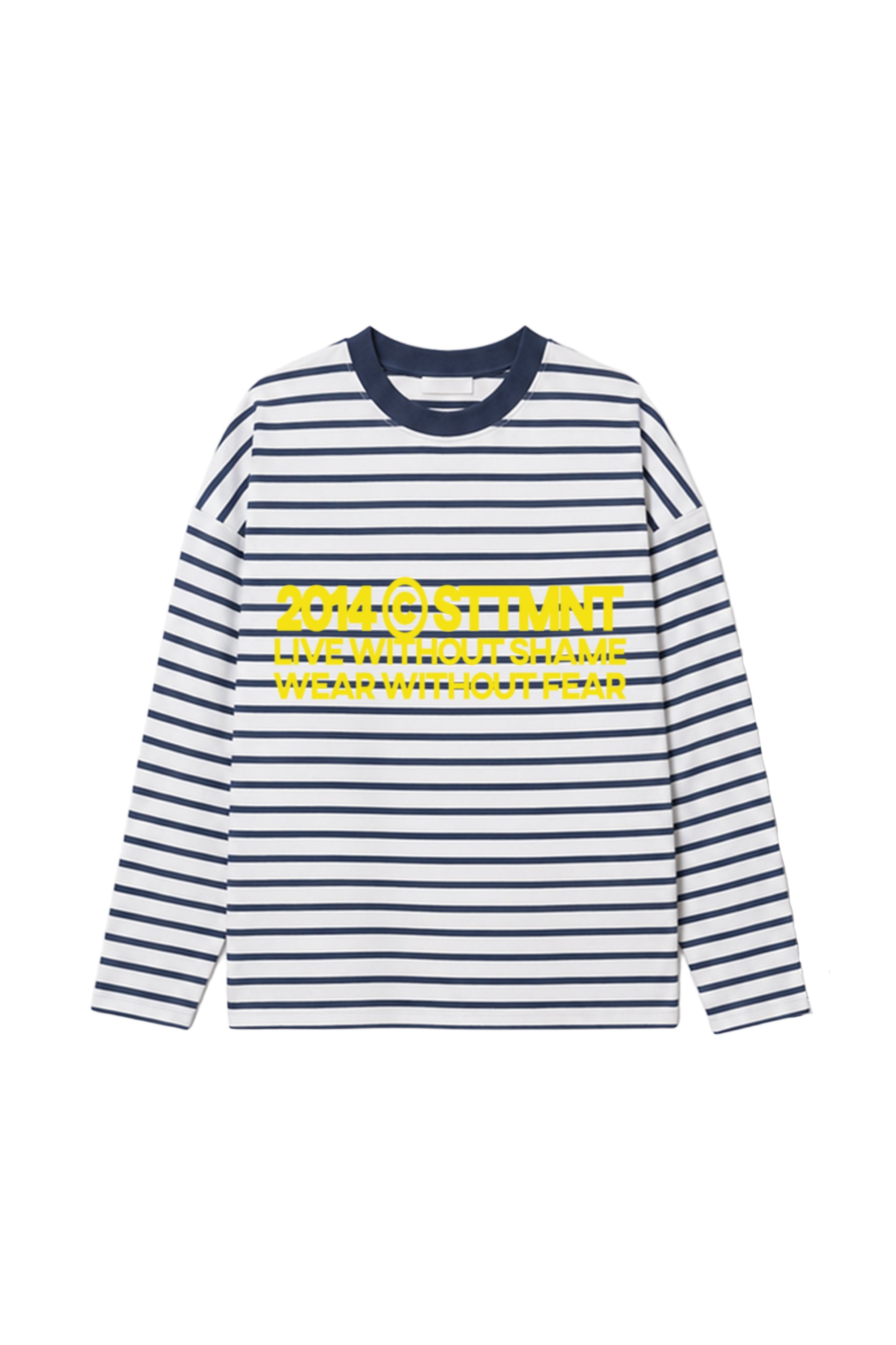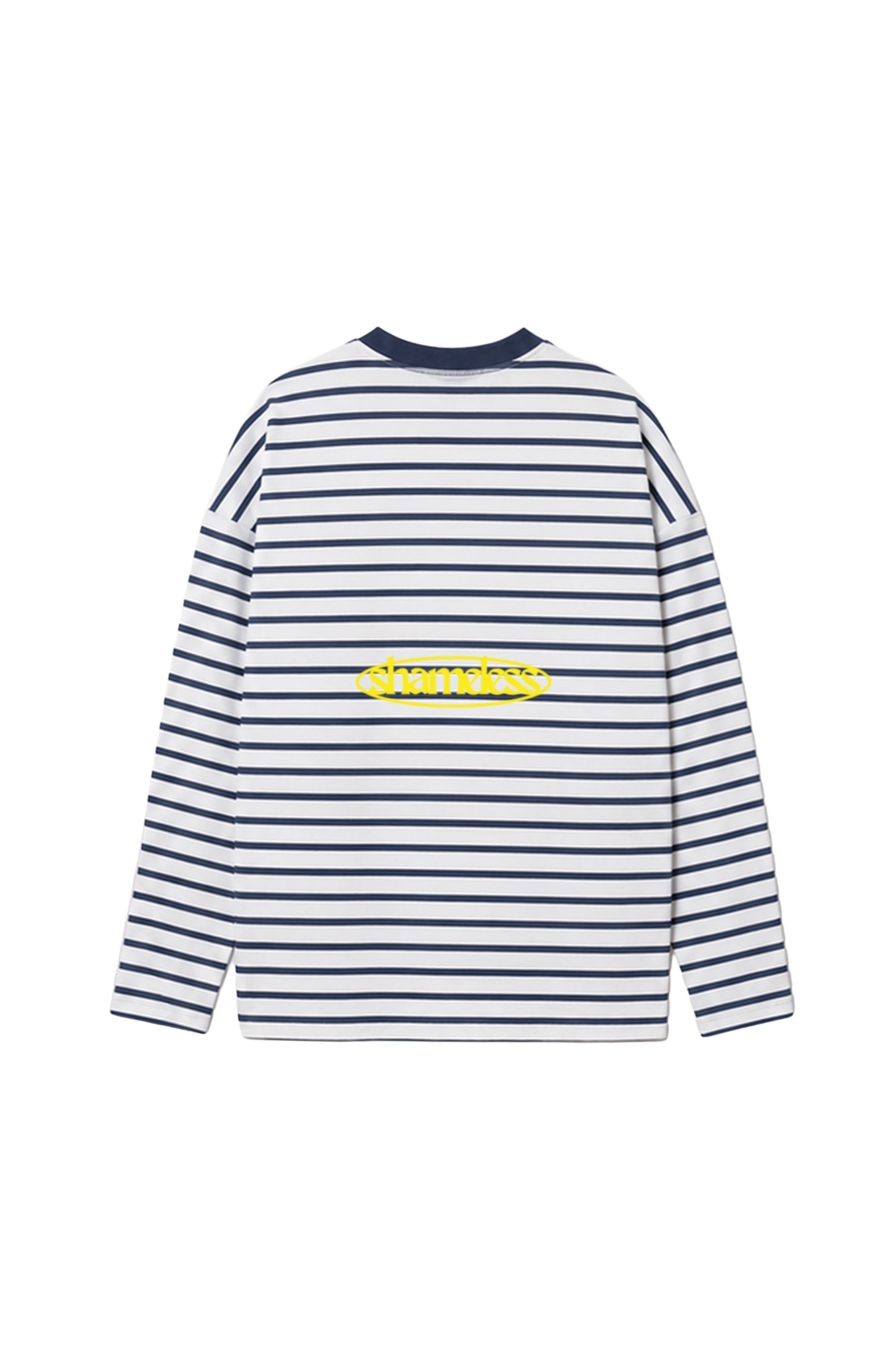 Striped blue and white crewneck made from midweight cotton fabric with an oversized fit. Details printed in yellow.
