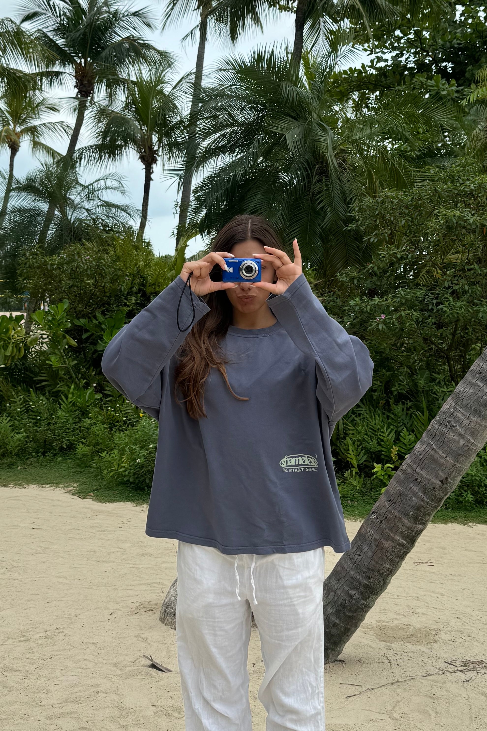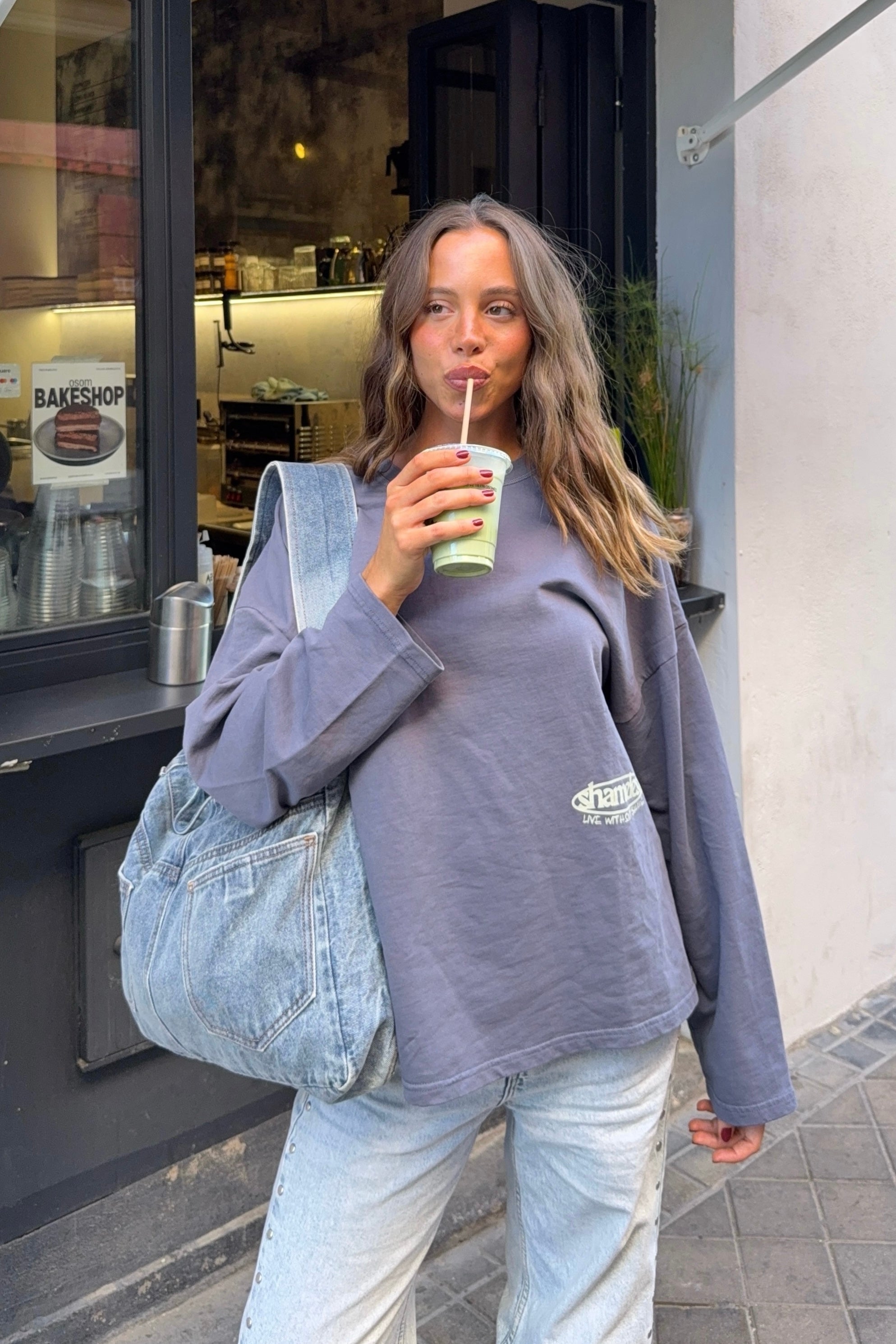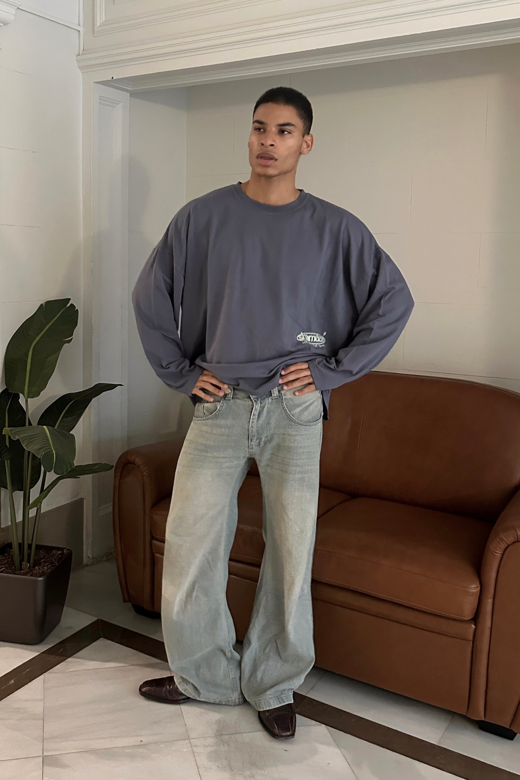 Washed blue crewneck made from midweight cotton fabric with an oversized fit. Details printed in light green.