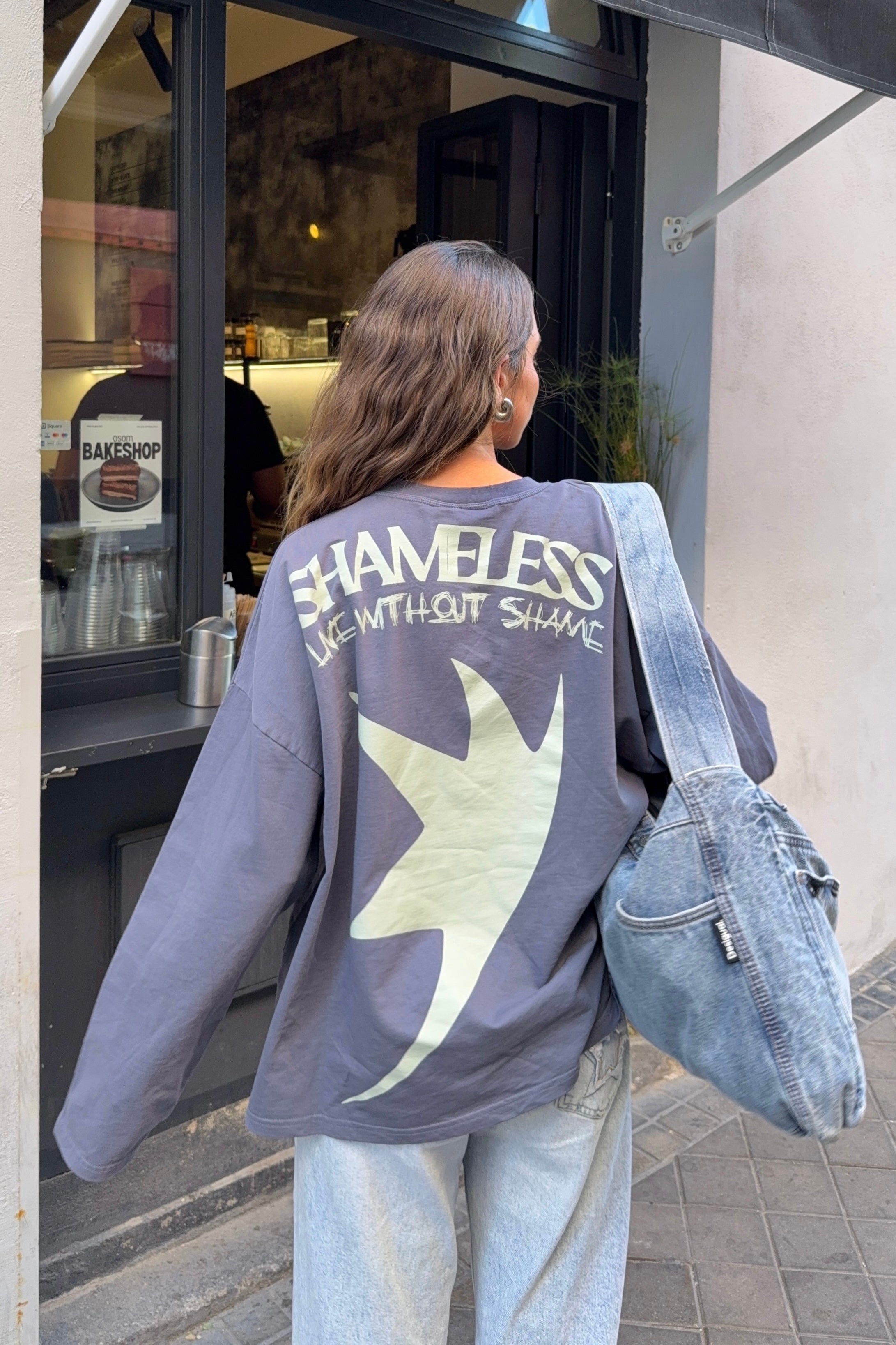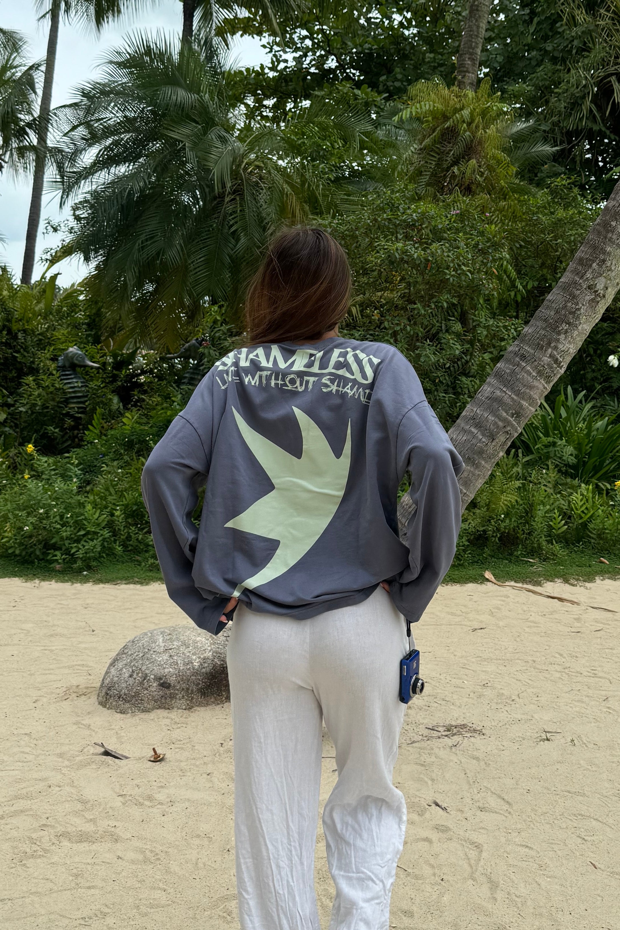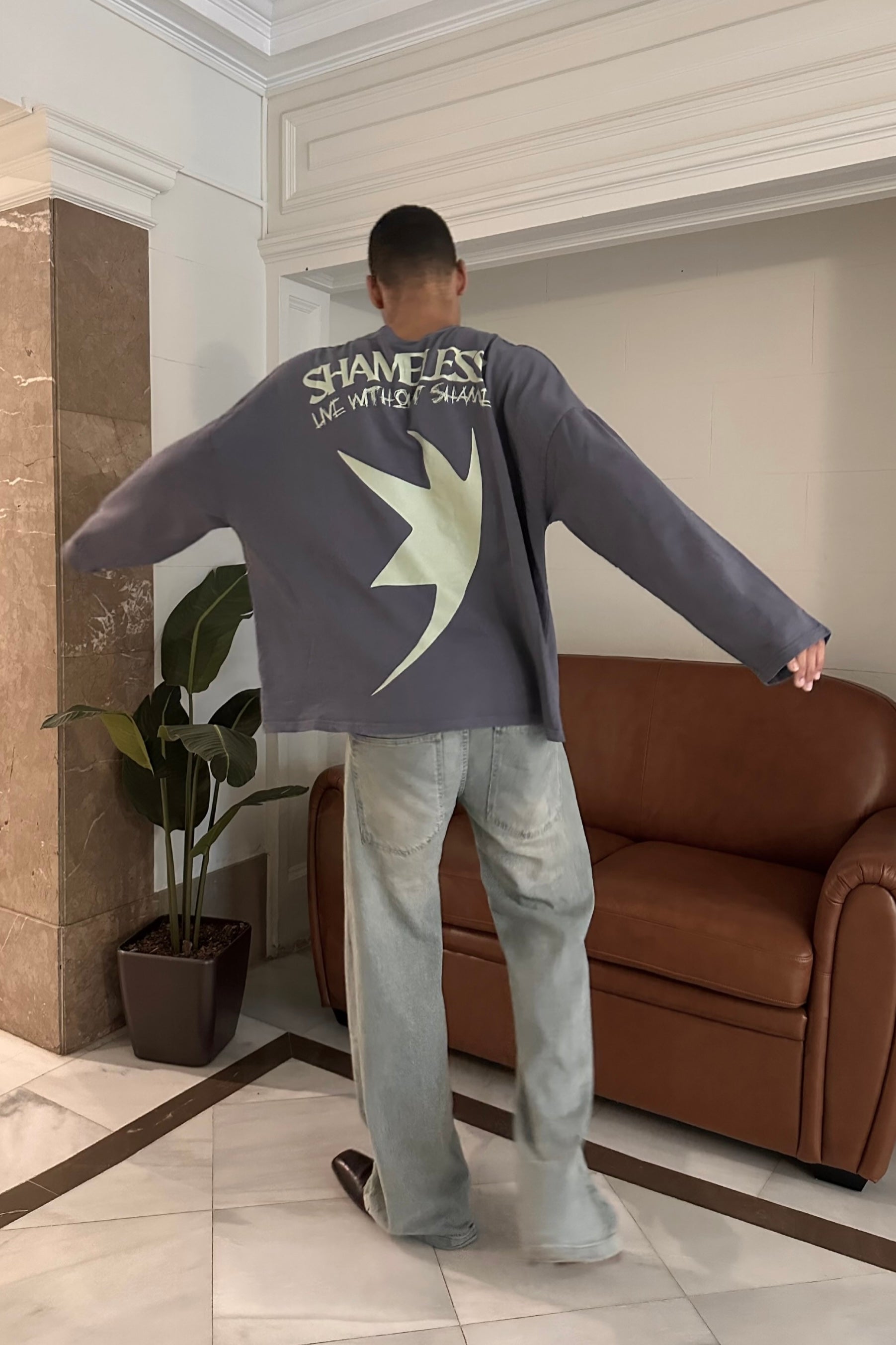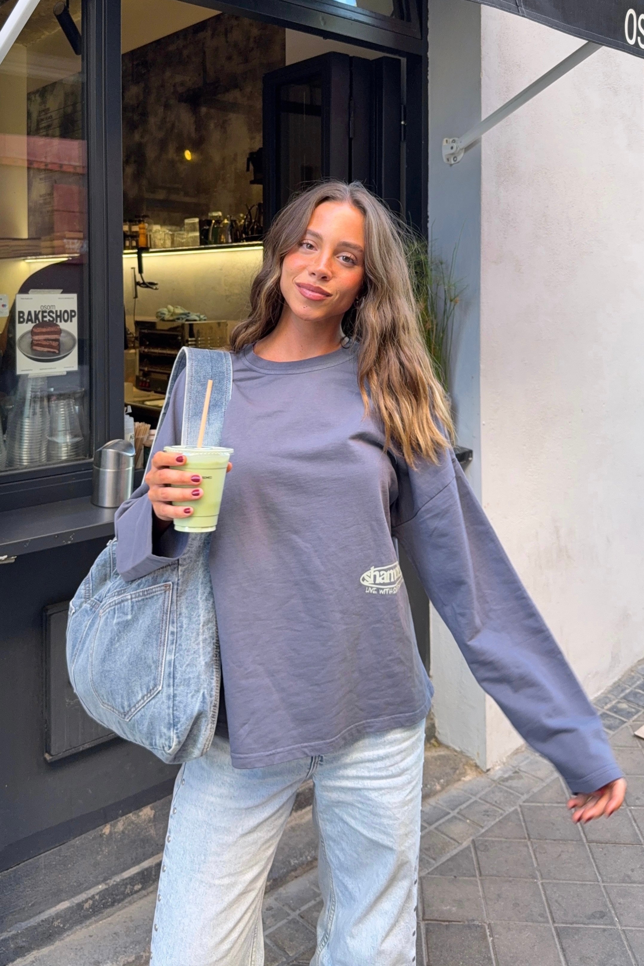 Washed blue crewneck made from midweight cotton fabric with an oversized fit. Details printed in light green.