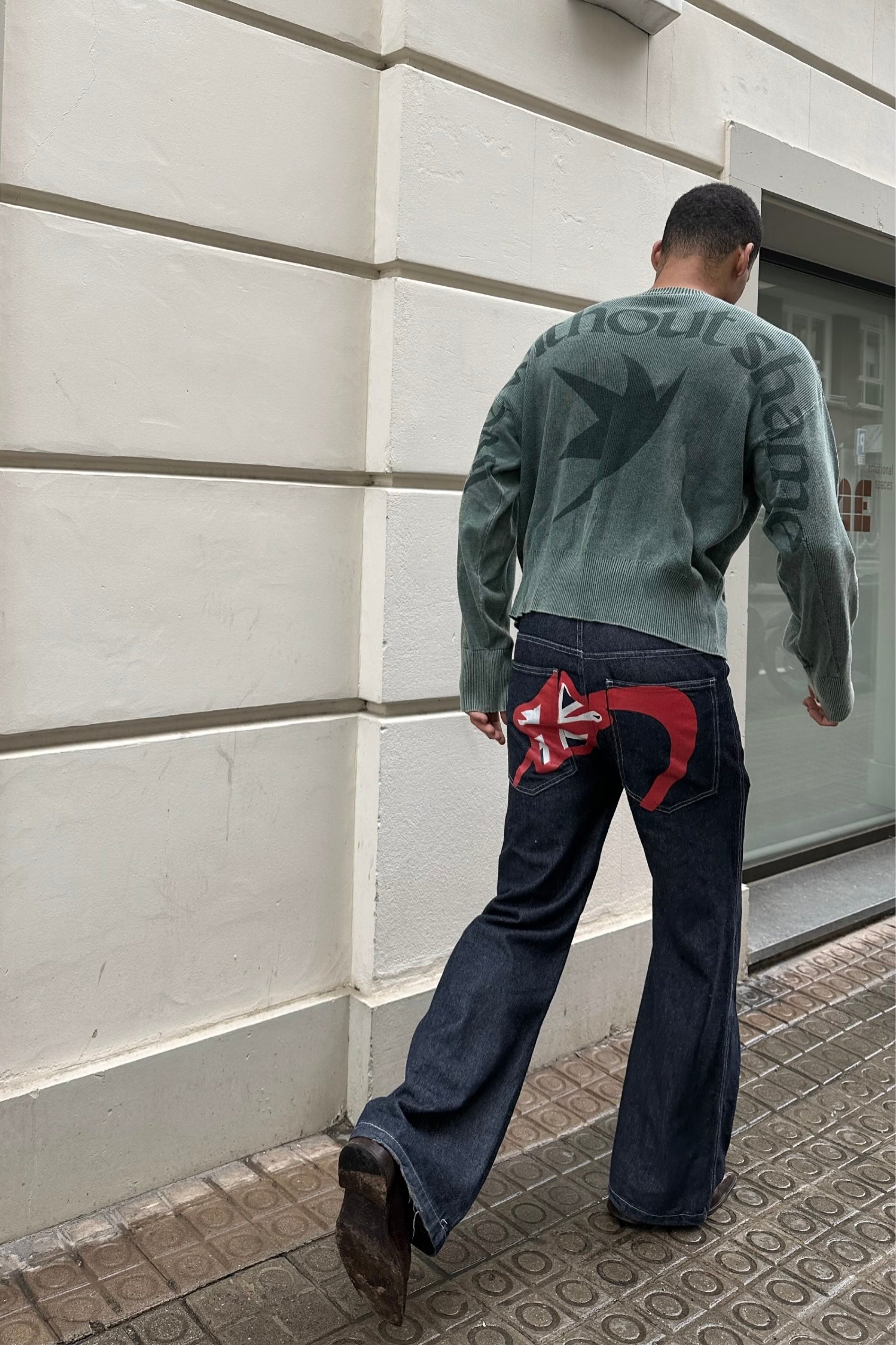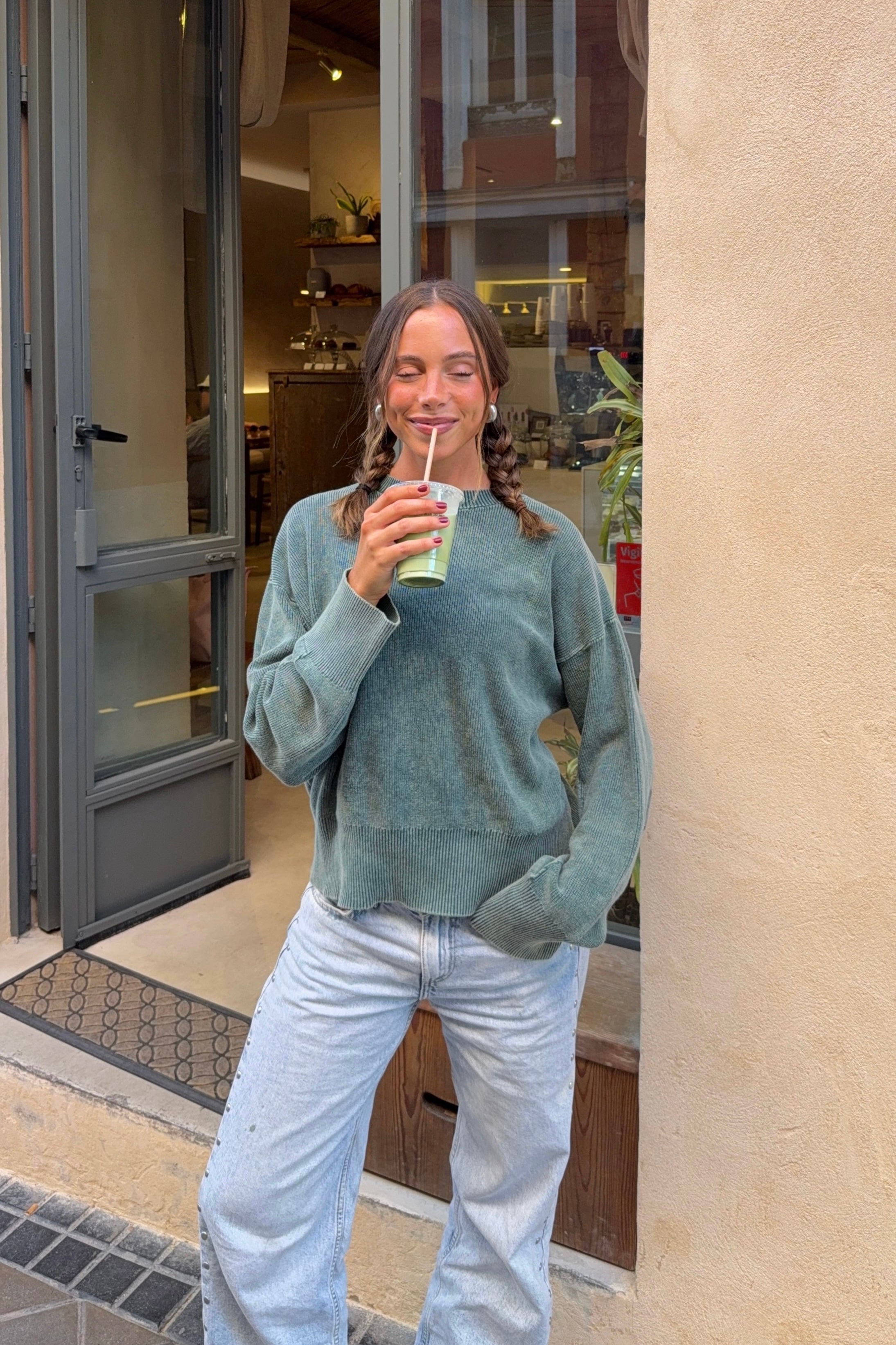 Green knitwear made from midweight cotton fabric with a boxy, oversized fit. Details printed in dark green.