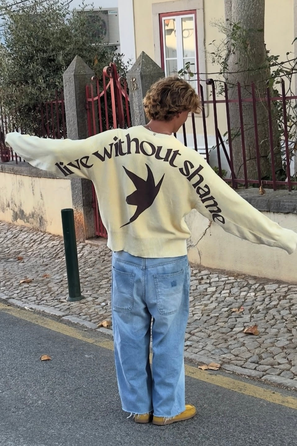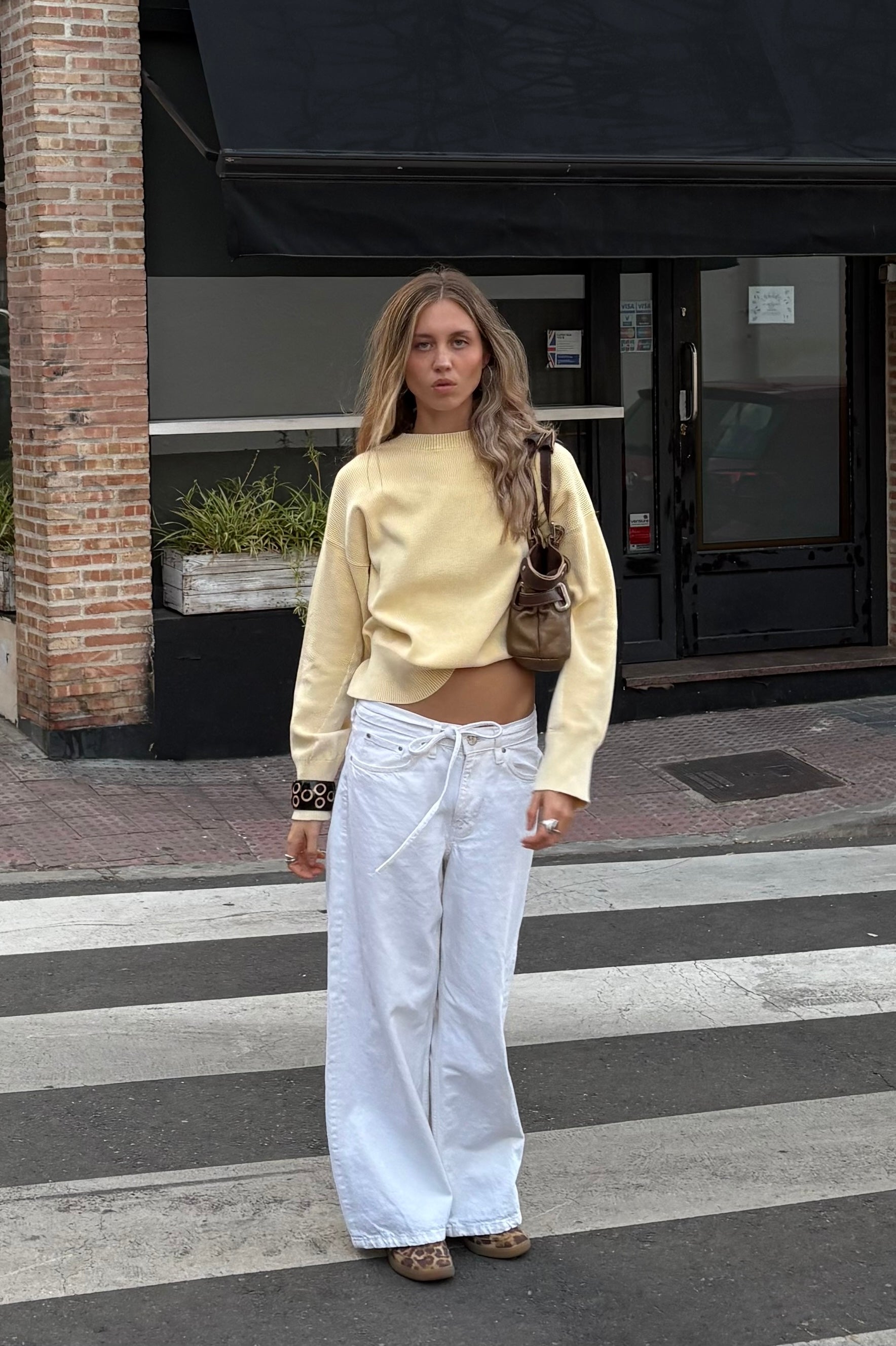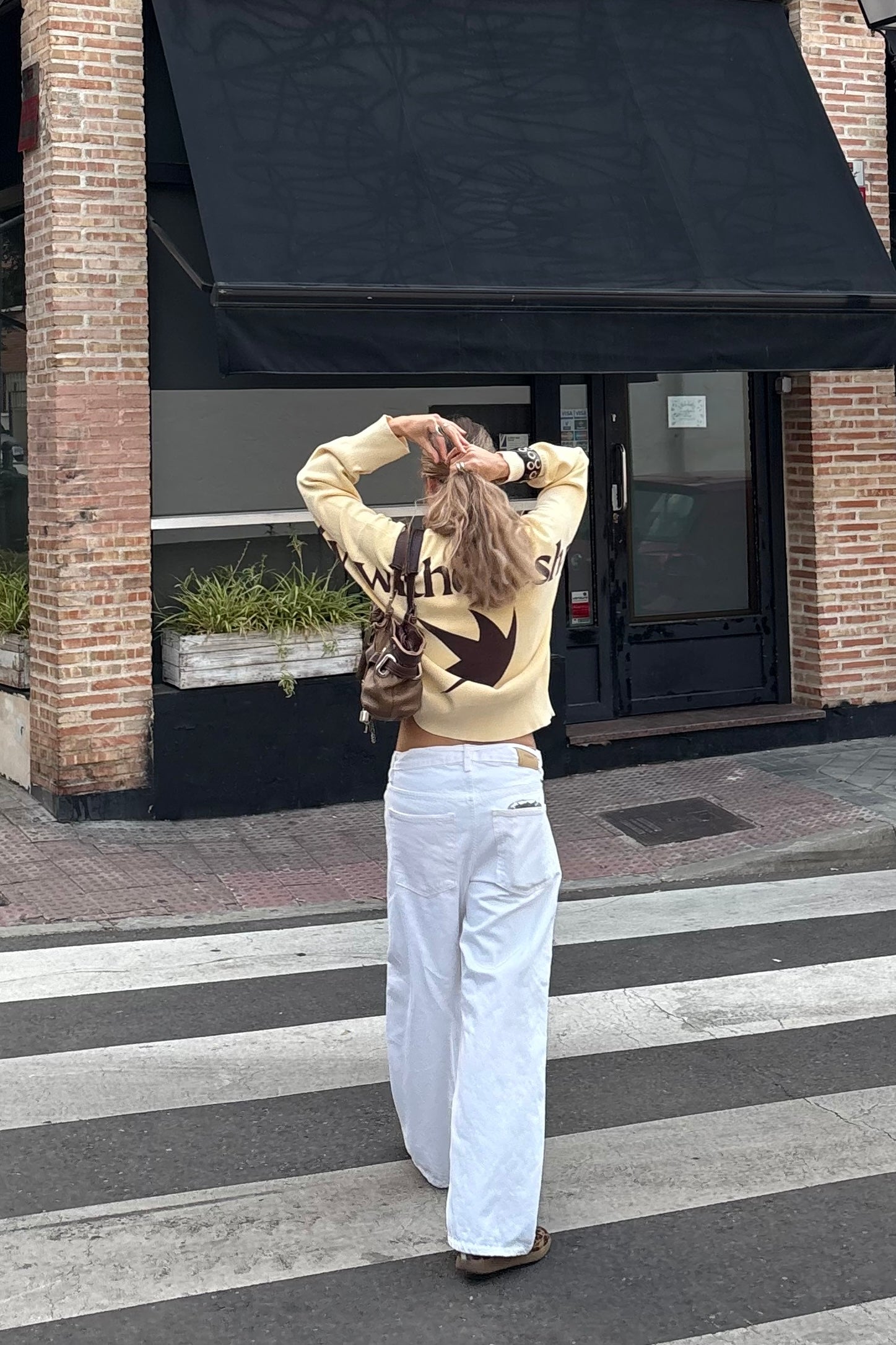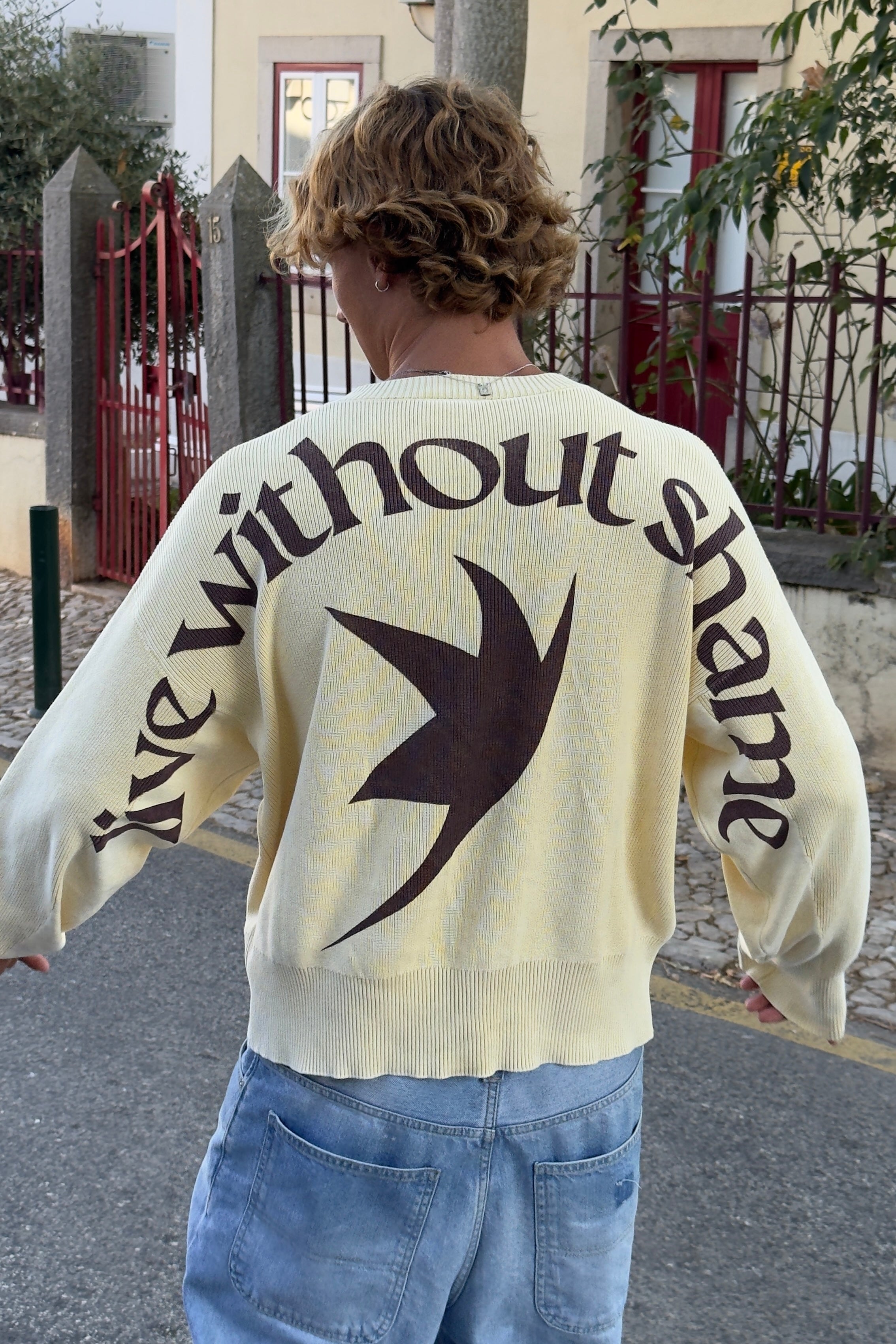 Off-white knitwear made from midweight cotton fabric with a boxy, oversized fit. Details printed in dark brown.