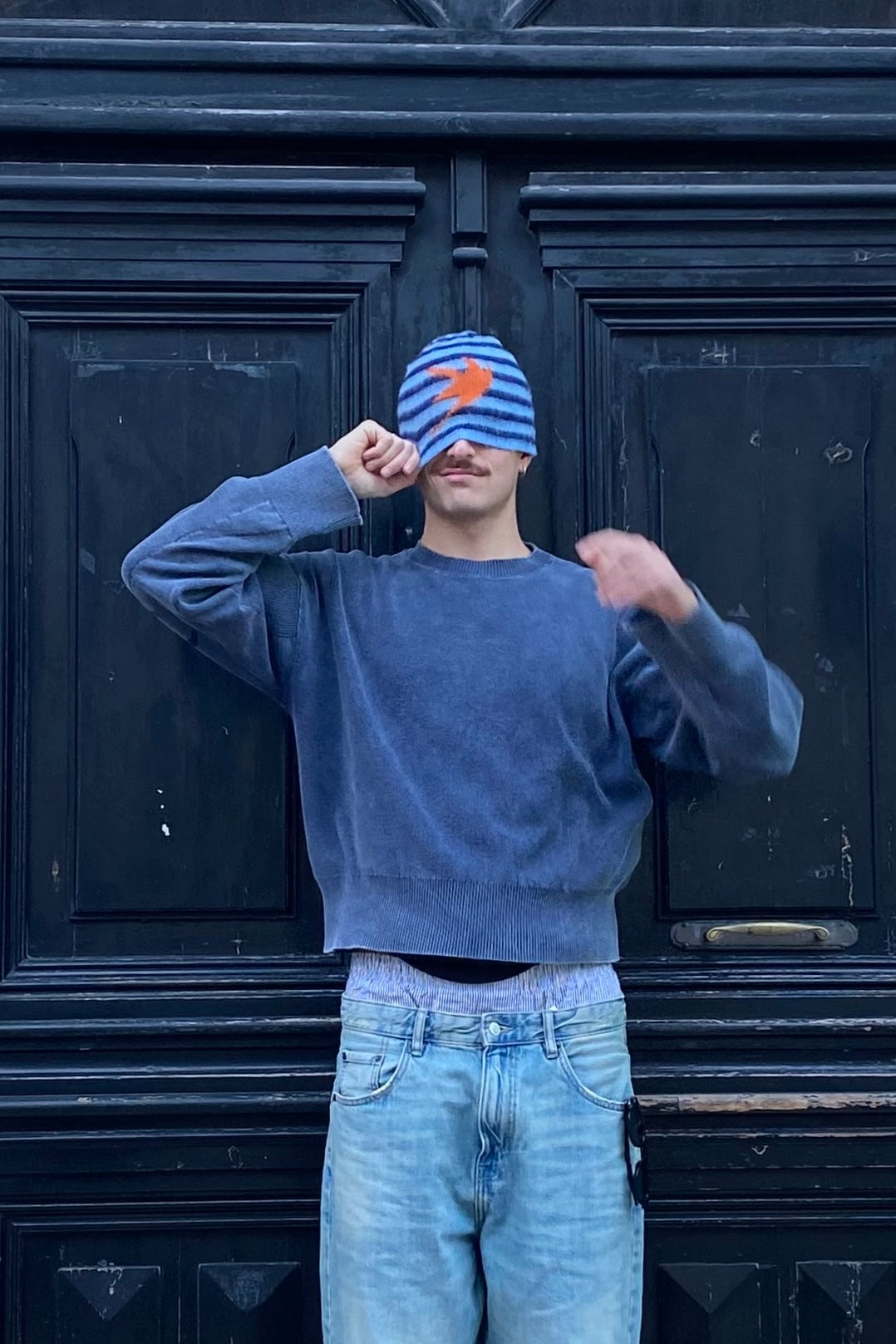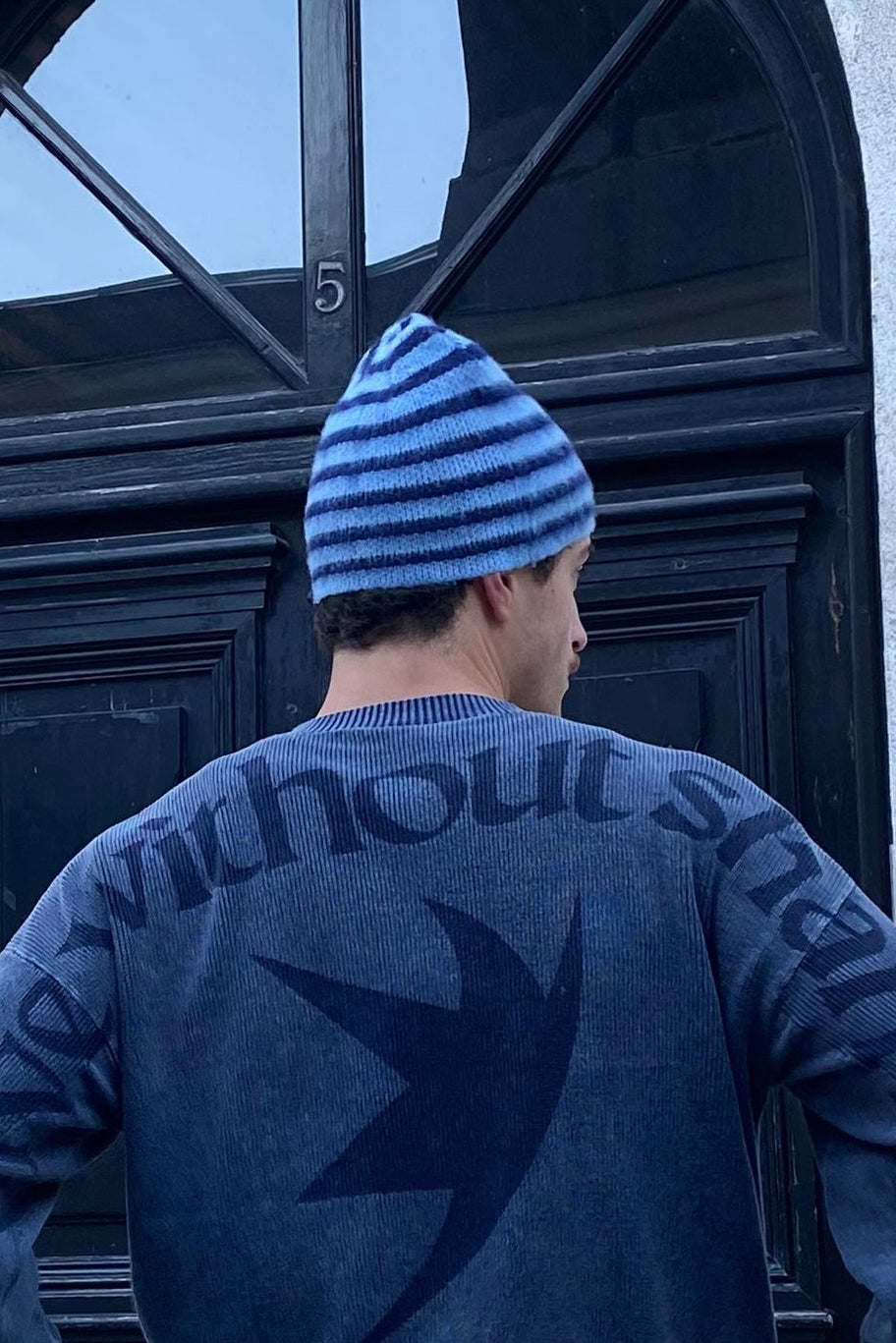 Crocheted wool beanie, made of dark blue and light blue stripes. Designed with a soft, fuzzy hair texture. Includes a bold orange icon on the front.