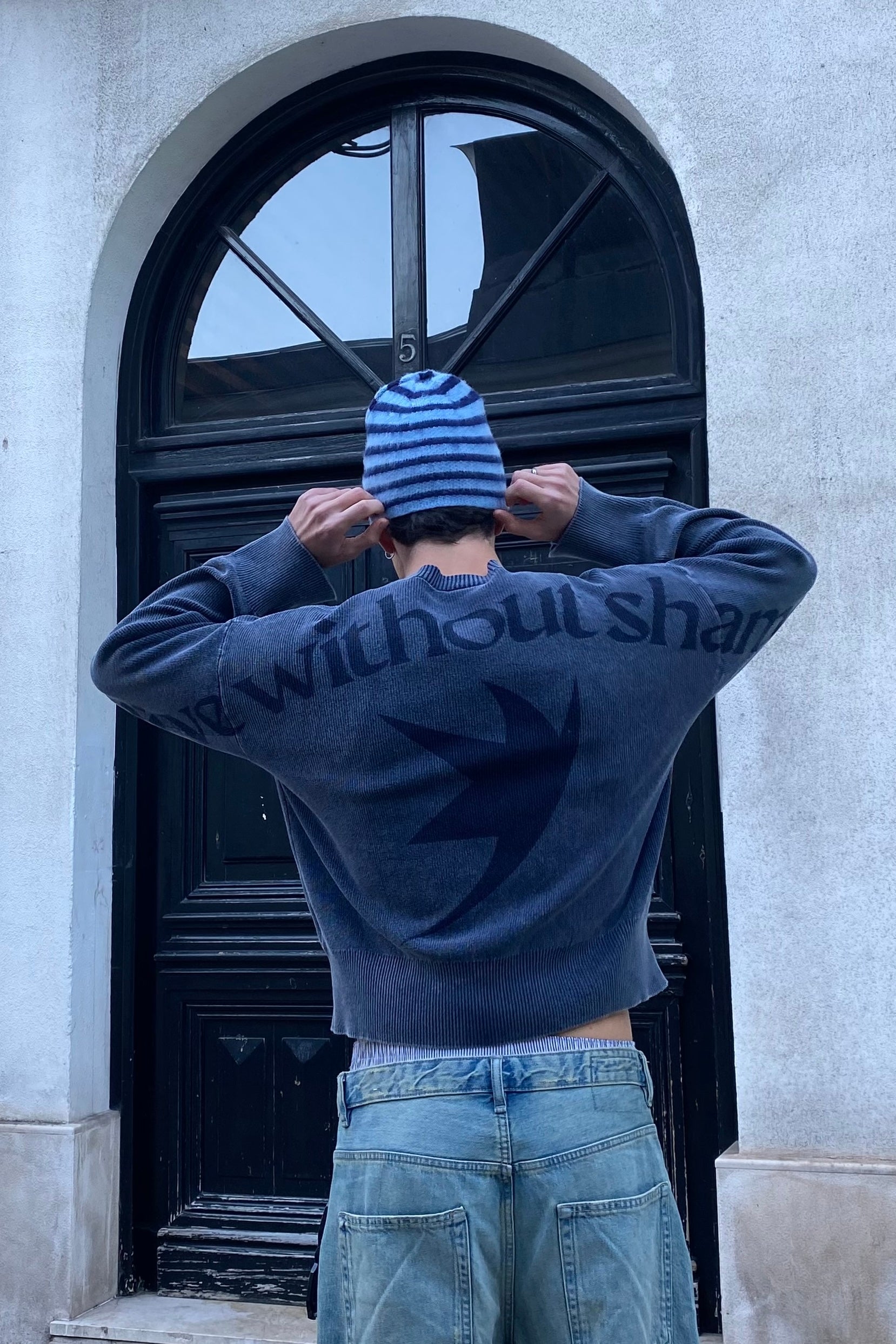 Blue knitwear made from midweight cotton fabric with a boxy, oversized fit. Details printed in dark blue.